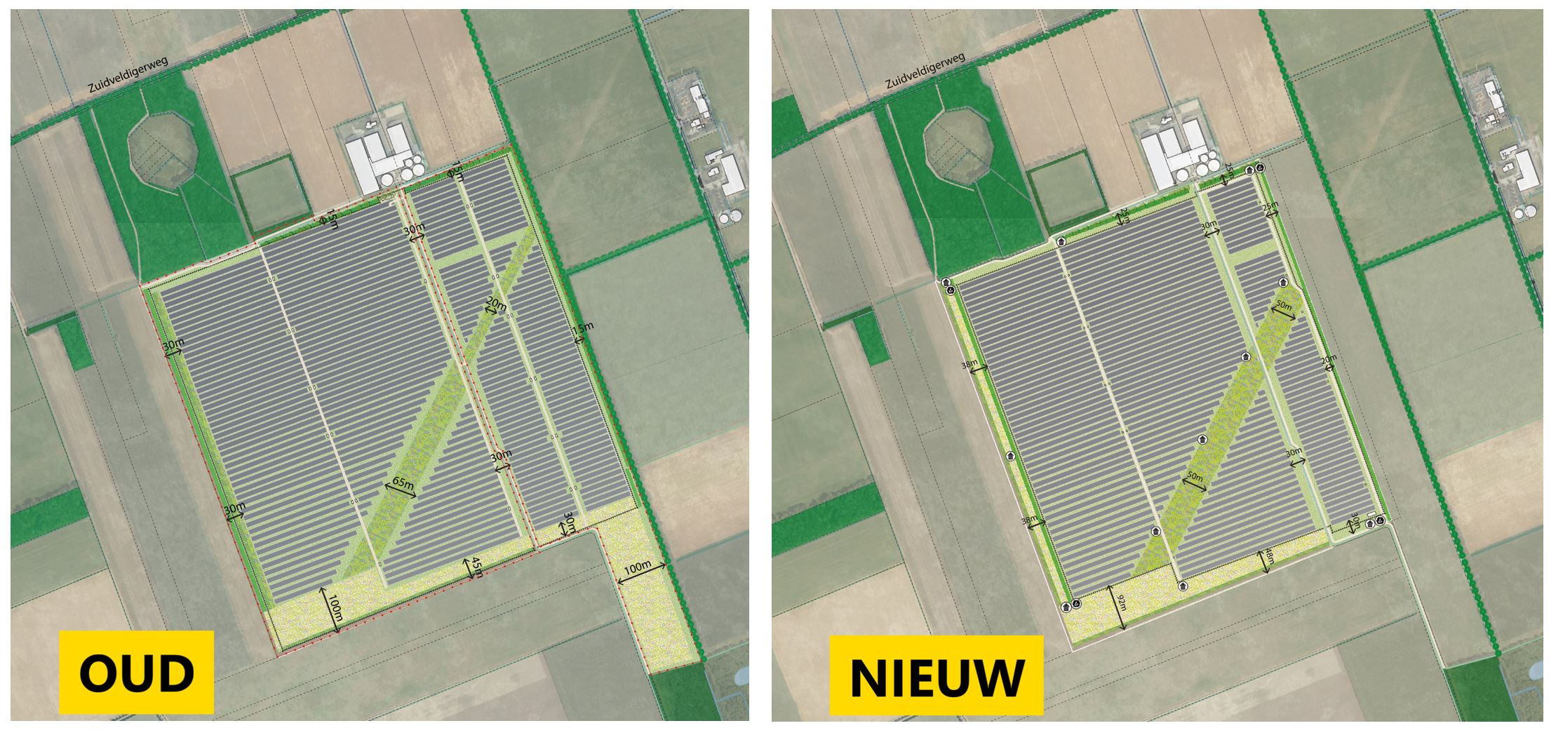 Het beoogde zonnepark bij Zuidvelde wordt een kwart kleiner dan eerder gepland. Het totaal oppervlakte aan zonnepark is nu 74 hectare groot. De landschappelijke inpassing en groenstructuren zijn circa 35 hectare groot.